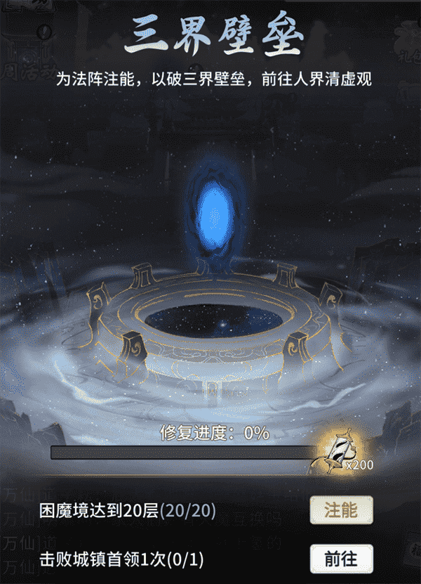 当你修为达到返虚/破虚中期后,,,可在城镇寻得芸丫并激活神秘法阵,,,通过收集材料、、、、击败首领等方式为法阵注能,,,,借以打破三界壁垒,,,,开启支线剧情“清虚旧梦”